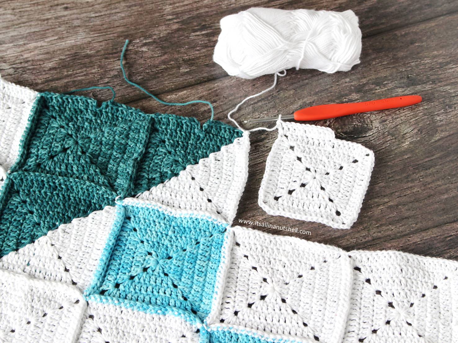 I work the blanket row by row, and after each row I work away the yarn tails. I was about a third into the blanket, with the tips of the snowflake just starting to show, when I realized that it’s going to take me forever to complete. The split-squares themselves are slow going, and there are a gazillion squares in this blanket.